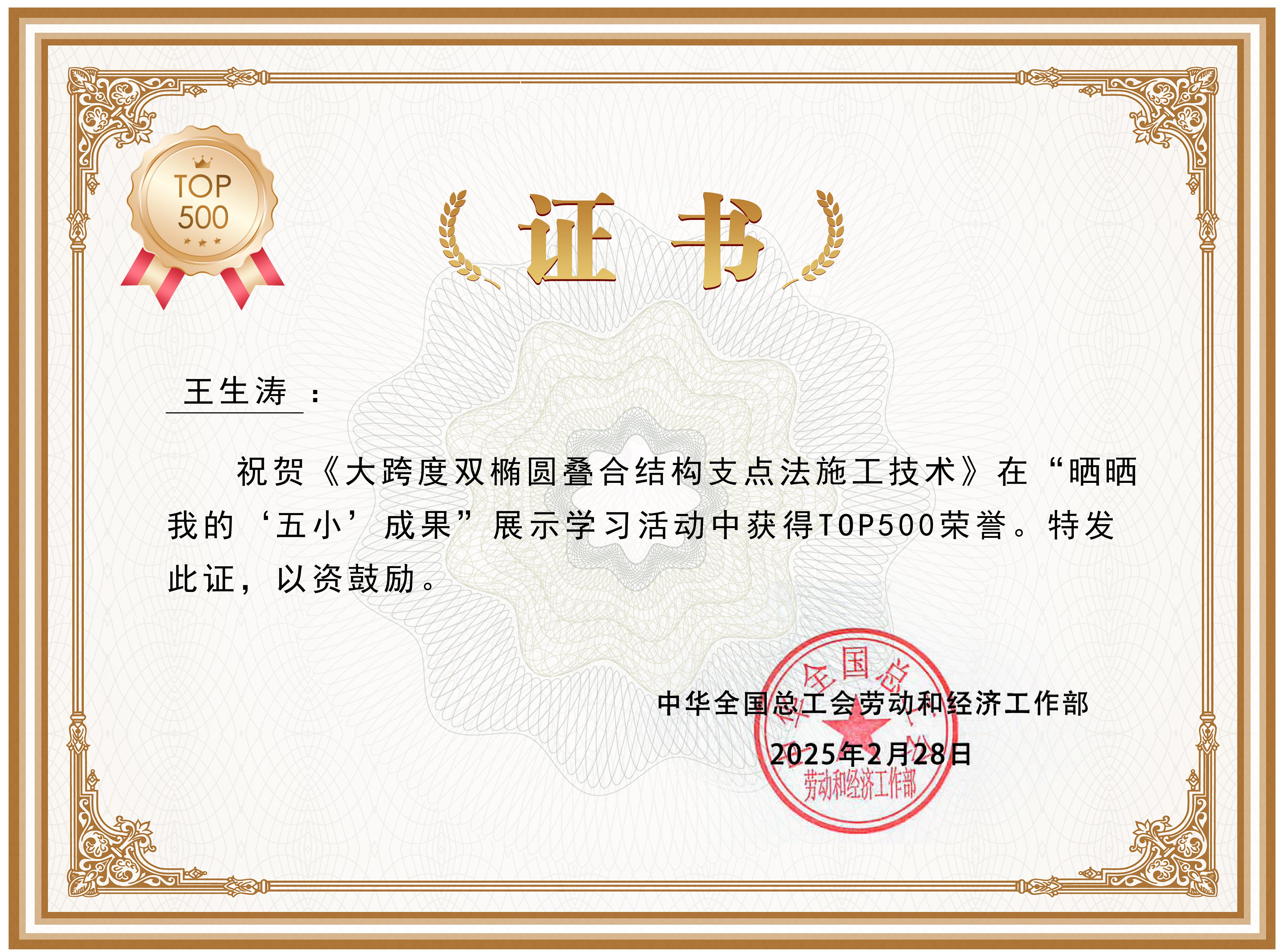 近日,中華全國總工會“曬曬我的‘五小’成果”展示學習活動結(jié)果揭曉,公司選送的《大跨度雙橢圓疊合結(jié)構(gòu)支點法施工技術》《適用于臨近河流軟土地層鋼套筒輔助接收控制施工合理化建議》經(jīng)過多輪投票,在5000個參選成果中脫穎而出,獲得TOP500殊榮,分別位列80名和147名。