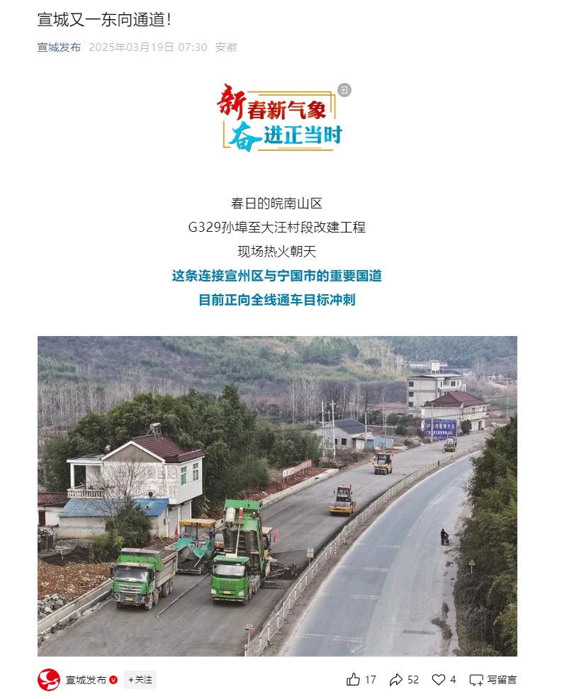 春日的皖南山區(qū),G329孫埠至大汪村段改建工程現(xiàn)場熱火朝天。攤鋪機(jī)、壓路機(jī)與運(yùn)輸車輛轟鳴交織,滾燙的瀝青蒸騰起陣陣白霧。這條連接宣州區(qū)與寧國市的重要國道,目前正向全線通車目標(biāo)沖刺。作為融入長三角的重要通道,項(xiàng)目建成后,宣城至寧國通行時(shí)間將大大縮短,惠及沿線10萬余群眾。