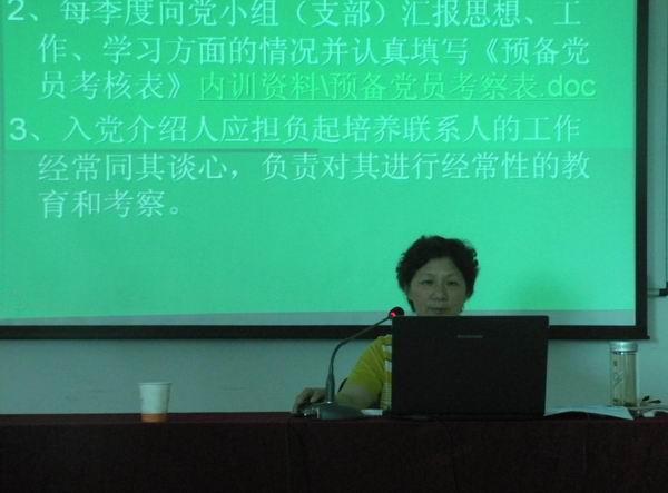 黨委辦公室主任劉昀主持了培訓(xùn)會,并就發(fā)展黨員工作程序,作了專題講座。劉主任通過PPT課件,系統(tǒng)的介紹了黨員發(fā)展程序,從制訂發(fā)展黨員的工作計(jì)劃開始,到預(yù)備黨員轉(zhuǎn)正、整個入黨材料存入個人檔案,以及最后的責(zé)任追究都作了詳細(xì)介紹,讓與會人員對發(fā)展黨員工作的程序有了清楚的了解。隨后,大家一起觀看了《欲之害——段義和腐敗案件警示錄》。專題片揭露了段義和利用職務(wù)便利大肆索賄的腐敗行徑,深刻揭示了腐化墮落的思想根源和蛻變軌跡。通過觀看警示教育片,使大家接受了一次深刻的思想教育和精神洗禮,進(jìn)一步認(rèn)識了在新形式下反腐倡廉建設(shè)的重要性。