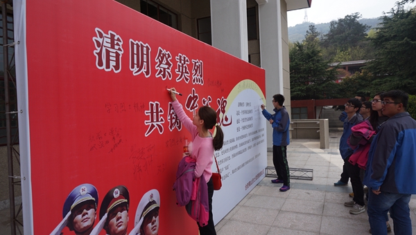 大家對革命先烈的墓碑進行清掃,向革命英雄三鞠躬,并敬獻了花籃,青年們來到抗日戰(zhàn)爭宣傳展板前參觀,追思為國家興衰、民族存亡不惜拋頭顱、灑熱血的英雄,深切緬懷革命先烈?;顒又校蠹以凇扒迕骷烙⒘?,共鑄中華魂”宣傳牌前依次留言明志,誓將革命先烈大無畏的奉獻精神傳承下去,在自己的崗位上開花結(jié)果,讓青春無悔。