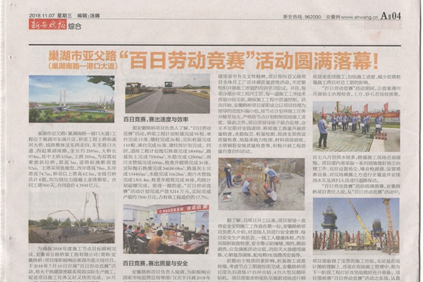 11月7日,《新安晚報(bào)環(huán)湖新聞》專題報(bào)道了公司承建的巢湖亞父路裕溪河特大橋“百日勞動(dòng)競賽”活動(dòng)。