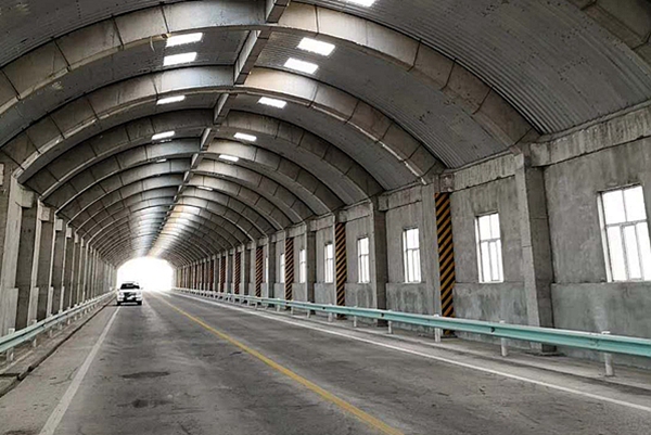 S201線路途徑瑪依塔斯風(fēng)區(qū),公司所承建的防風(fēng)雪試驗(yàn)工程在風(fēng)雪災(zāi)害最為嚴(yán)重的路段。該項(xiàng)目采用在路面上方建設(shè)一座仿造隧道式的棚洞,并用防雪網(wǎng)與擋雪板對(duì)棚洞的進(jìn)出口及風(fēng)吹雪嚴(yán)重路段進(jìn)行防護(hù),以防止吹雪在路面和棚洞洞口處堆積造成通行困難。棚洞主體采用鋼筋混凝土框架結(jié)構(gòu),能抵抗12級(jí)大風(fēng)。為了行車(chē)安全,還在棚洞內(nèi)部設(shè)置了波形梁護(hù)欄。該項(xiàng)目也是目前國(guó)內(nèi)首例采用棚洞工程進(jìn)行吹雪防治的嘗試,開(kāi)辟了新疆地區(qū)科技創(chuàng)新成果與實(shí)際工程結(jié)合應(yīng)用的新篇章。