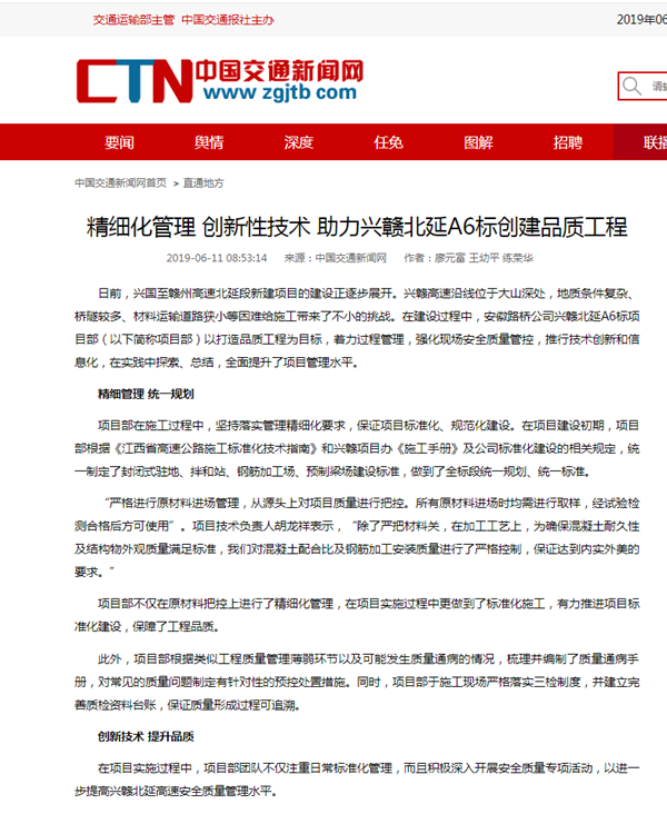 近日,中國交通新聞網(wǎng)以《精細(xì)化管理 創(chuàng)新性技術(shù) 助力興贛北延A6標(biāo)創(chuàng)建品質(zhì)工程》為題,對公司承建的江西興贛北延A6標(biāo)項(xiàng)目建設(shè)進(jìn)行了專題報(bào)道。