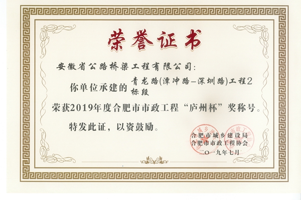 市政分公司三項目喜獲“廬州杯” 發(fā)布時間:2019年07月29日 來源:市政分公司 發(fā)布人: 作者:王東 瀏覽:3694次 近日從合肥市政工程協(xié)會獲悉,公司承建的阜陽北路一標、阜陽北路二標、青龍路二標等項目喜獲“廬州杯”。截至目前,市政分公司已累計獲得19個“廬州杯”獎項。