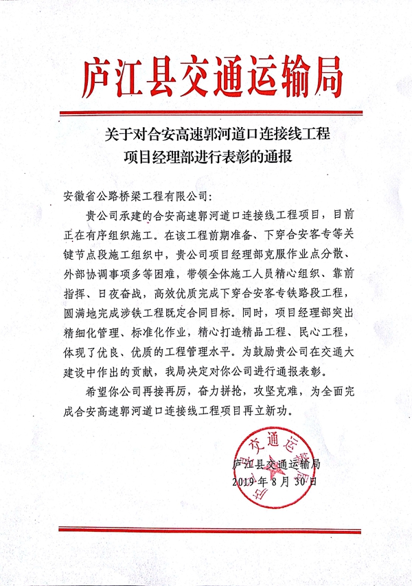 近期,廬江縣交通運(yùn)輸局對郭柯路項(xiàng)目圓滿完成涉鐵工程既定合同目標(biāo)進(jìn)行了通報表彰。