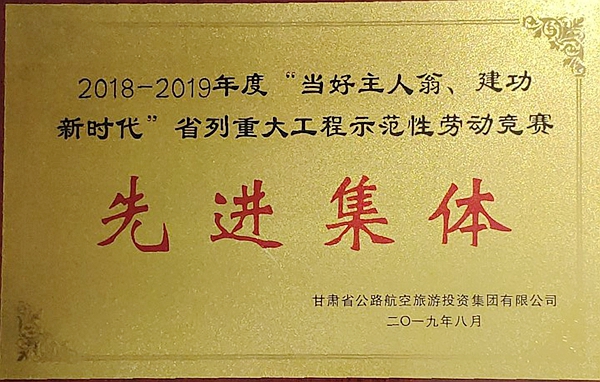 因在甘肅省公航旅集團開展的2018-2019年度“當(dāng)好主人翁、建功新時代”省列重大工程示范性勞動競賽活動中表現(xiàn)優(yōu)異,11月17日,銀百高速TY14標(biāo)被授予“先進集體”稱號,項目負(fù)責(zé)人同時榮獲“優(yōu)秀項目經(jīng)理”稱號。