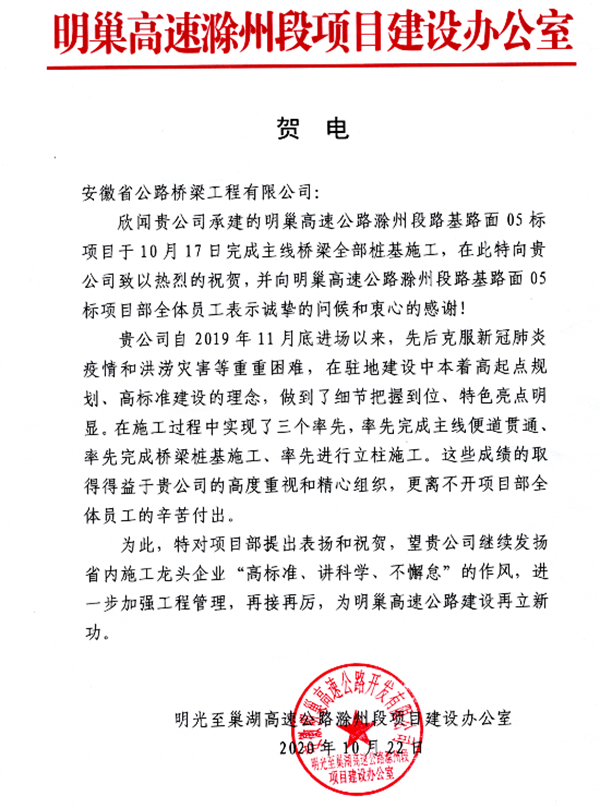 近日,明巢高速滁州段項(xiàng)目辦發(fā)來賀電,對(duì)公司承建的明巢高速路基路面05標(biāo)項(xiàng)目完成主線橋梁全部樁基施工任務(wù)表示祝賀,并向全體參建人員表示感謝。