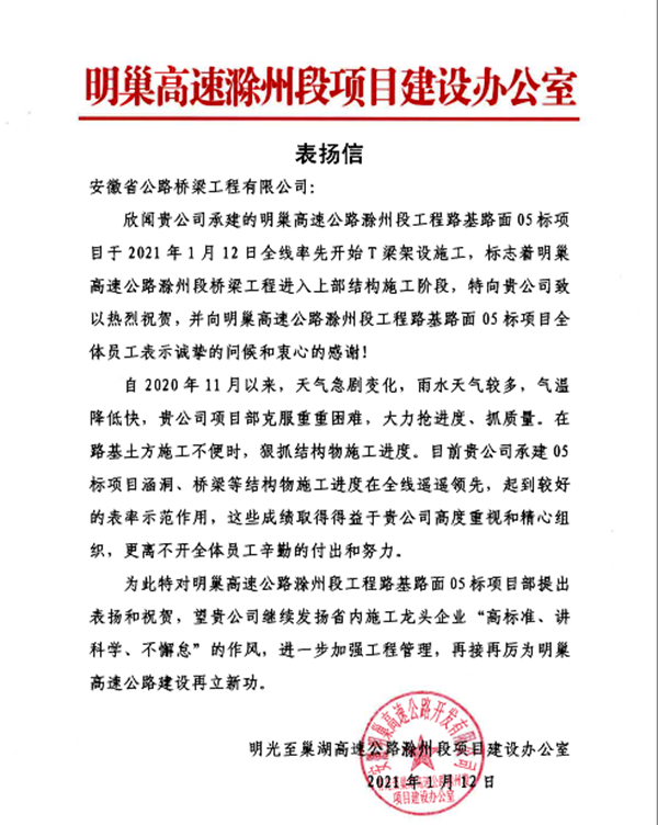 1月12日,明巢高速滁州段項目辦給公司來信,對公司承建的明巢高速05標(biāo)在全線率先開始T梁架設(shè)進(jìn)行表揚(yáng)。