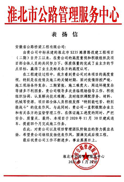 1月28日,淮北市公路管理服務中心向公司發(fā)來表揚信,對淮北S235項目團隊保質(zhì)保量提前完成施工任務給予表揚。