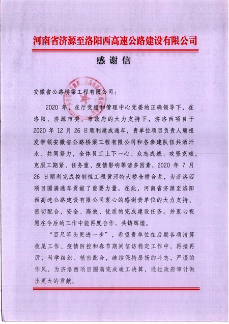 黃河特大橋項(xiàng)目收到業(yè)主來信感謝