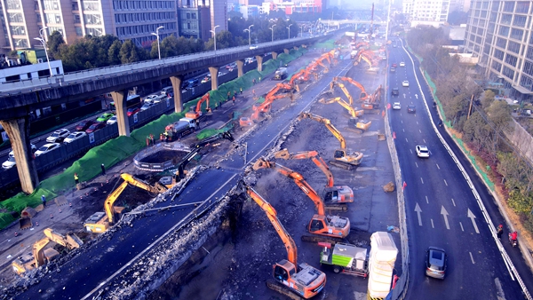 2020年12月4日22時,項目封閉施工,正式吹響大干的號角。26天后,首根墩柱順利澆筑。2月3日,30臺大型破碎機組成“鋼鐵戰(zhàn)隊”,僅用15個小時便完成了原計劃兩天才能完成的匝道拆除任務。3月25日,經過35天的持續(xù)奮戰(zhàn),主線橋第四聯(lián)順利架設,提前拉開了上部結構施工的序幕。