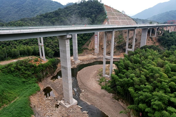 真正敢于挑戰(zhàn)的建設(shè)者,需要非凡的毅力和勇氣。位于標(biāo)頭的徽水河大橋進場時,每一臺機械設(shè)備都“寸步難行”,每一米道路修筑都要用爆破方式挖掉硬石。他們歷經(jīng)雨水、烈日的輪流考驗,立起了一排排筆直的墩柱,架起了一片片堅實的梁板,將最艱難的1公里鍛造而成。