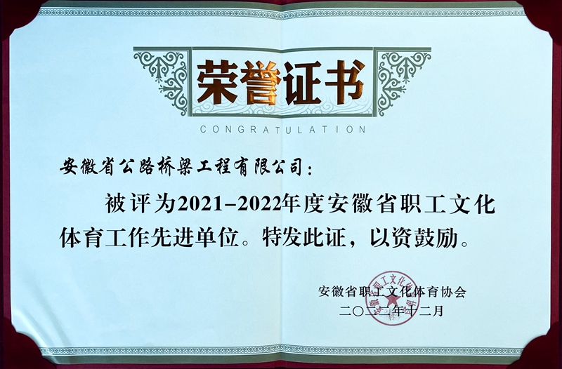 近日,安徽省職工文化體育協(xié)會發(fā)布了《關(guān)于表彰安徽省職工文化體育工作先進單位的通報》,授予安徽省公路橋梁工程有限公司等13家企事業(yè)單位“2021-2022年度安徽省職工文化體育工作先進單位”稱號。