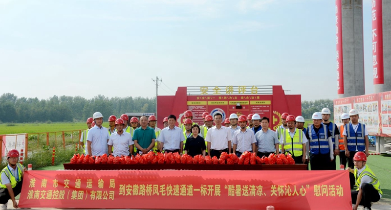 8月11日下午,淮南市交通運(yùn)輸局黨組成員、副局長(zhǎng)潘理想到鳳毛快速通道01標(biāo)項(xiàng)目開展“送清涼”慰問(wèn)活動(dòng)。