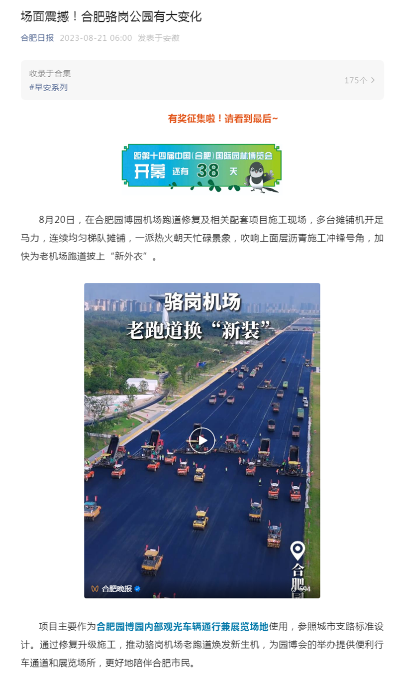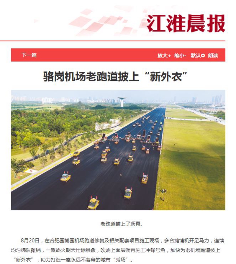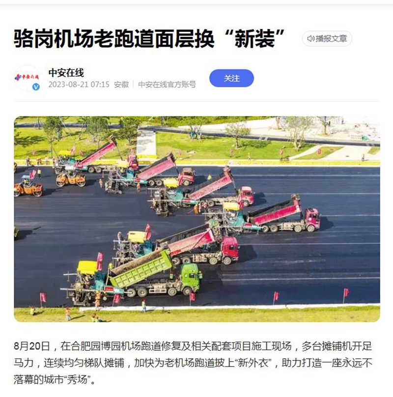 8月20日,公司承建的駱崗中央公園合肥園博園機場跑道修復(fù)工程項目進行瀝青攤鋪施工,中安在線、合肥日報、江淮晨報和合肥晚報等多家省市級媒體聚焦報道。