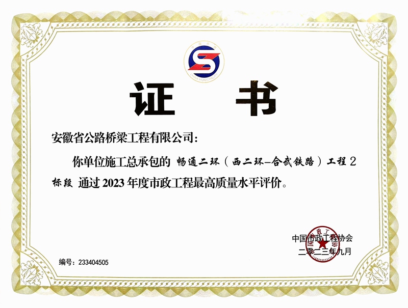 暢通二環(huán)(西二環(huán)-合武鐵路)工程2標(biāo)段榮獲市政最高質(zhì)量水平評(píng)價(jià)獎(jiǎng)