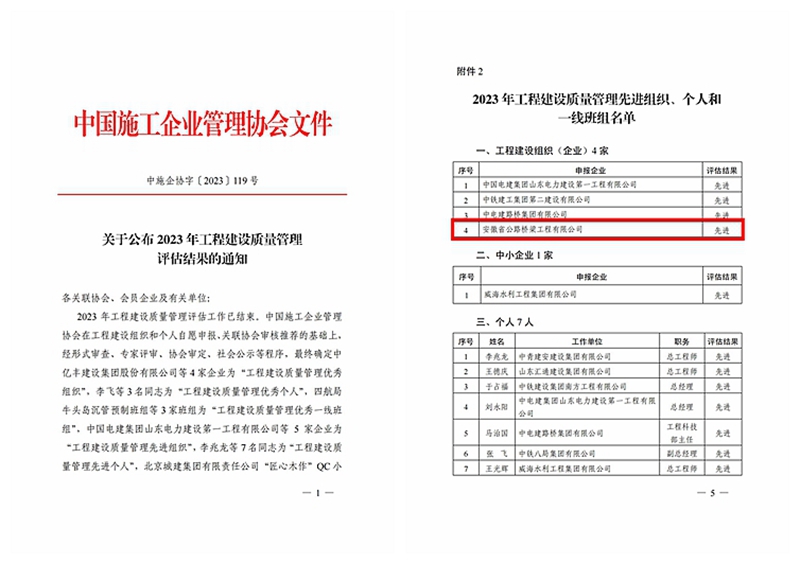 近日,中國施工企業(yè)管理協(xié)會公布了“2023年工程建設(shè)質(zhì)量管理”評估結(jié)果,公司在與眾多央企競爭角逐下脫穎而出,入選“2023年工程建設(shè)質(zhì)量管理先進組織”,是安徽省內(nèi)唯一一家入選企業(yè)。