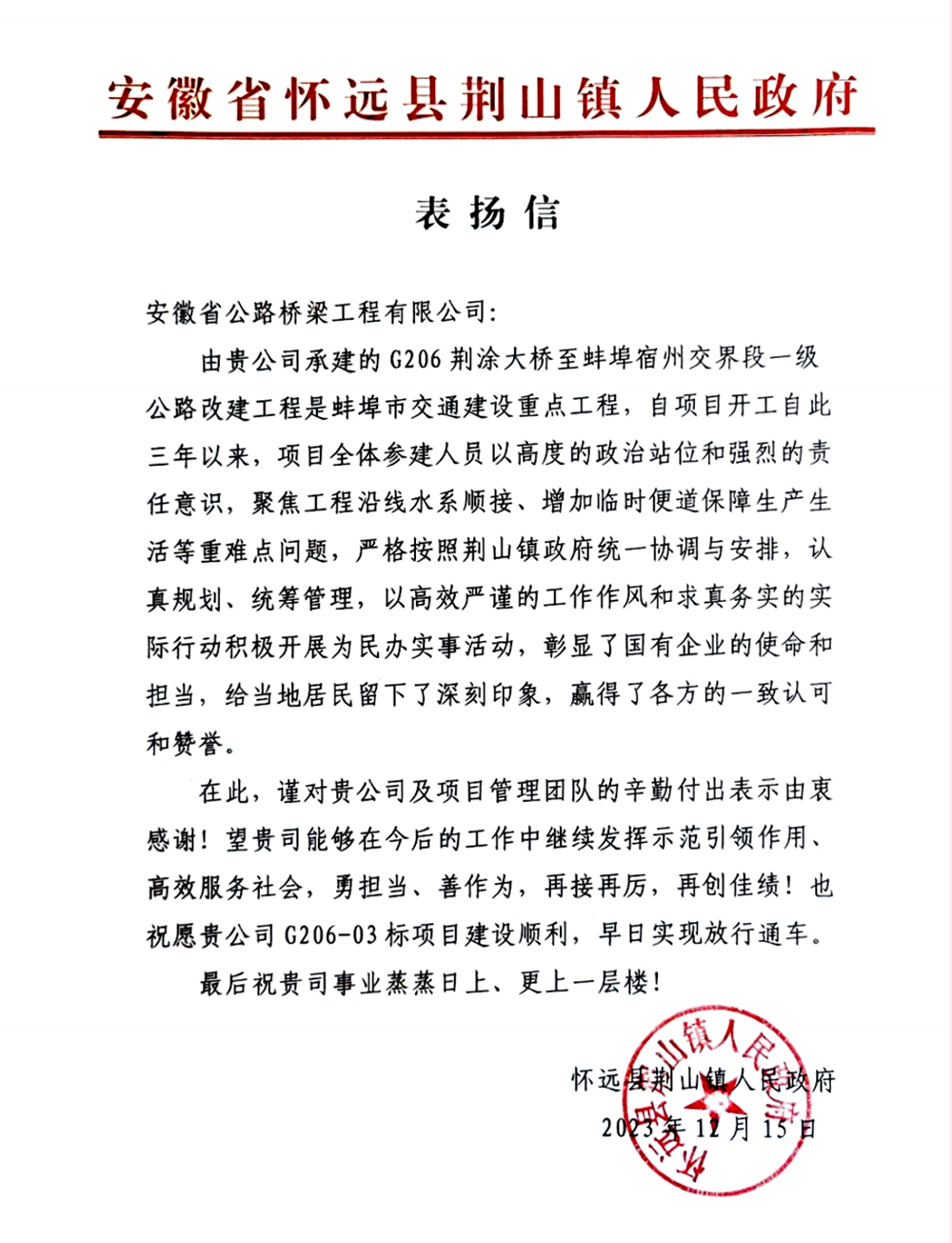 懷遠(yuǎn)縣荊山鎮(zhèn)人民政府來信表示,G206荊涂大橋蚌埠至宿州交界段一級(jí)公路改建工程03標(biāo)項(xiàng)目全體參建人員積極與政府協(xié)調(diào)配合,推動(dòng)項(xiàng)目高質(zhì)量建設(shè),以實(shí)際行動(dòng)積極開展為群眾辦實(shí)事活動(dòng),踐行了國企擔(dān)當(dāng)。