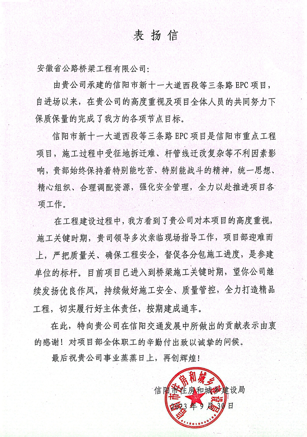 信陽市住房和城鄉(xiāng)建設(shè)局來信指出,信陽新十一大道項(xiàng)目在施工過程中克服征地拆遷難、桿管線遷改復(fù)雜等不利因素影響,始終發(fā)揚(yáng)“特別能吃苦、特別能戰(zhàn)斗”的企業(yè)作風(fēng),嚴(yán)把質(zhì)量關(guān)、安全關(guān),高質(zhì)高效推進(jìn)項(xiàng)目建設(shè),為信陽交通發(fā)展做出了突出貢獻(xiàn)。