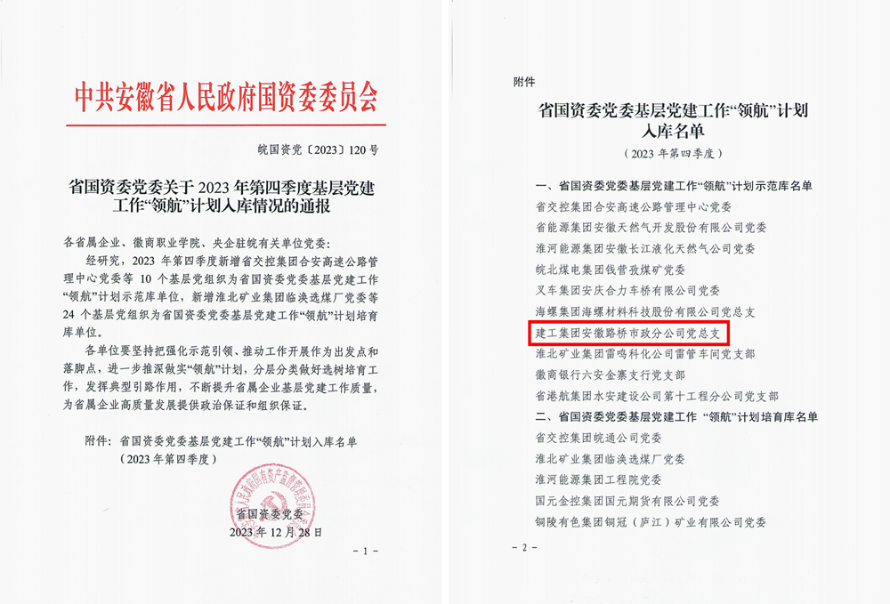 近日,安徽省國(guó)資委發(fā)布《關(guān)于2023年第四季度基層黨建工作“領(lǐng)航”計(jì)劃入庫情況的通報(bào)》,安徽路橋市政分公司黨總支成功入選省國(guó)資委黨委基層黨建工作“領(lǐng)航”計(jì)劃示范庫。