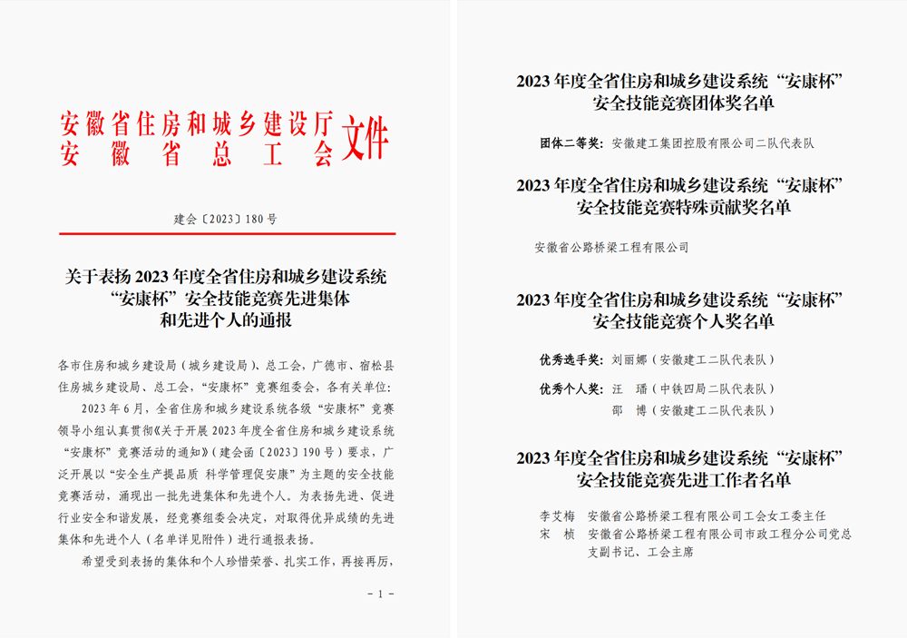 近日,安徽省總工會(huì)、住房城鄉(xiāng)建設(shè)廳聯(lián)合發(fā)布《關(guān)于表?yè)P(yáng)2023年度全省住房和城鄉(xiāng)建設(shè)系統(tǒng)“安康杯”安全技能競(jìng)賽先進(jìn)集體和先進(jìn)個(gè)人的通報(bào)》,公司榮獲競(jìng)賽特殊貢獻(xiàn)獎(jiǎng),以公司選手為主力的安徽建工二隊(duì)獲得競(jìng)賽團(tuán)體二等獎(jiǎng)。公司職工宋楨、李艾梅獲競(jìng)賽“先進(jìn)工作者”,公司選手劉麗娜、邵博分獲競(jìng)賽“優(yōu)秀選手獎(jiǎng)”“優(yōu)秀個(gè)人獎(jiǎng)”。
