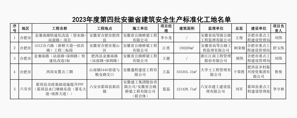 近日,安徽省建設(shè)工程質(zhì)量與安全協(xié)會公布2023年度第四批安徽省建筑安全生產(chǎn)標(biāo)準(zhǔn)化工地名單,由公司承建的金寨南路快速化改造(望水路-站前路)項目、G312合六路(新橋大道-侯店路)工程二標(biāo)段、金寨南路(站前路-深圳路)快速化改造1標(biāo)、霍邱縣市政基礎(chǔ)設(shè)施提升PPP(霍邱縣水門塘路東段(蓼東大道-靖淮大道))、肥西文旅西崗安置點(diǎn)三期等5個項目光榮上榜。