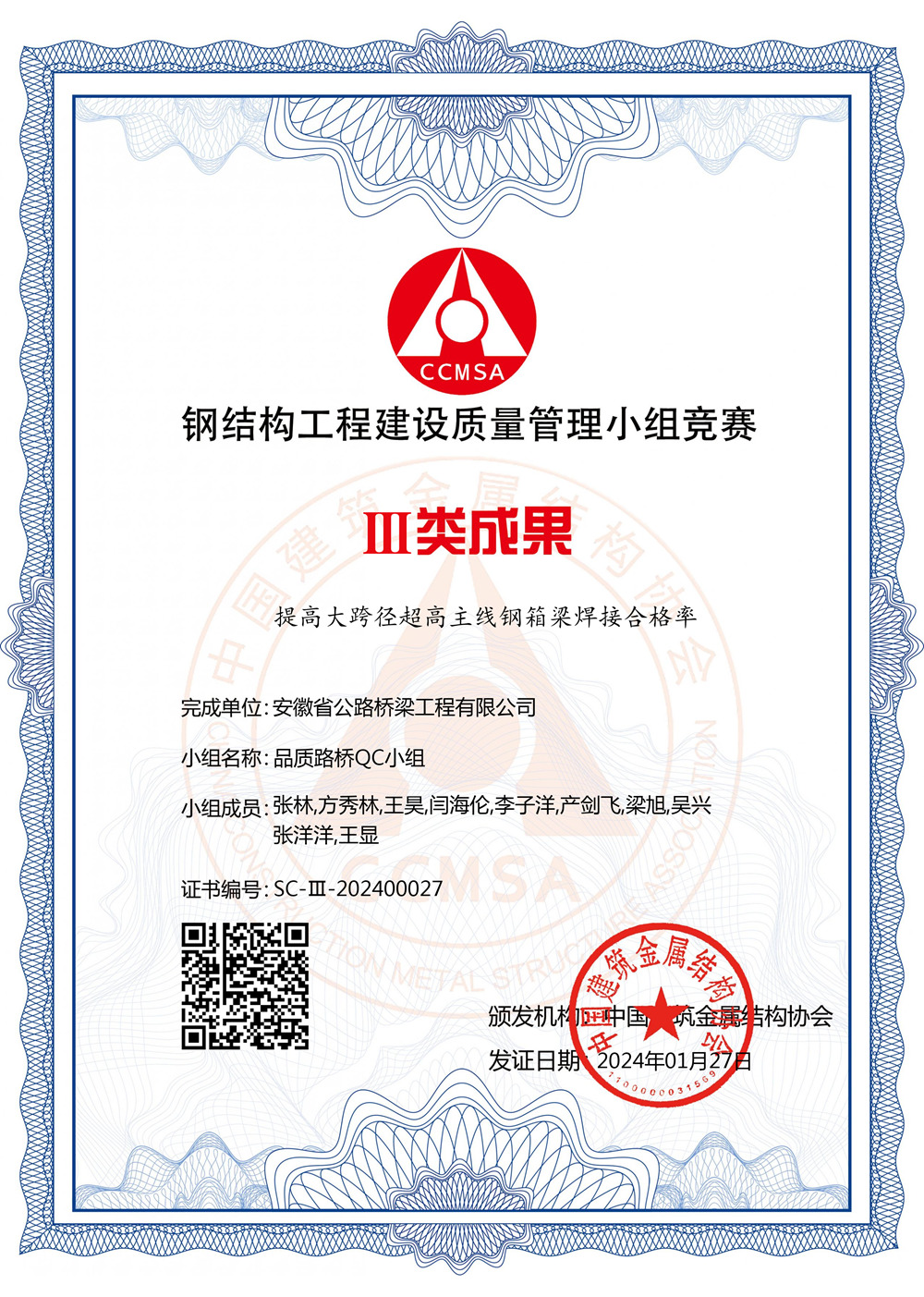 1月25日至27日,中國建筑金屬結(jié)構(gòu)協(xié)會(huì)在北京召開“2023年鋼結(jié)構(gòu)工程建設(shè)質(zhì)量管理小組競賽活動(dòng)”,公司獲得I類成果2項(xiàng),III類成果1項(xiàng)。