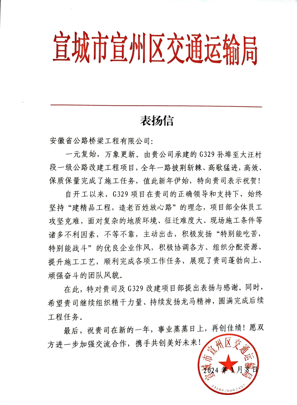 宣城市宣州區(qū)交通運(yùn)輸局來信指出,G329孫埠至大汪村段一級公路改建工程項(xiàng)目始終堅(jiān)持“建精品工程,造百姓放心路”的理念,克服地質(zhì)環(huán)境復(fù)雜、征遷難度大、施工條件差等諸多不利因素,積極協(xié)調(diào)各方,順利完成各項(xiàng)工作任務(wù),展現(xiàn)了項(xiàng)目團(tuán)隊(duì)頑強(qiáng)奮斗的精神風(fēng)貌。