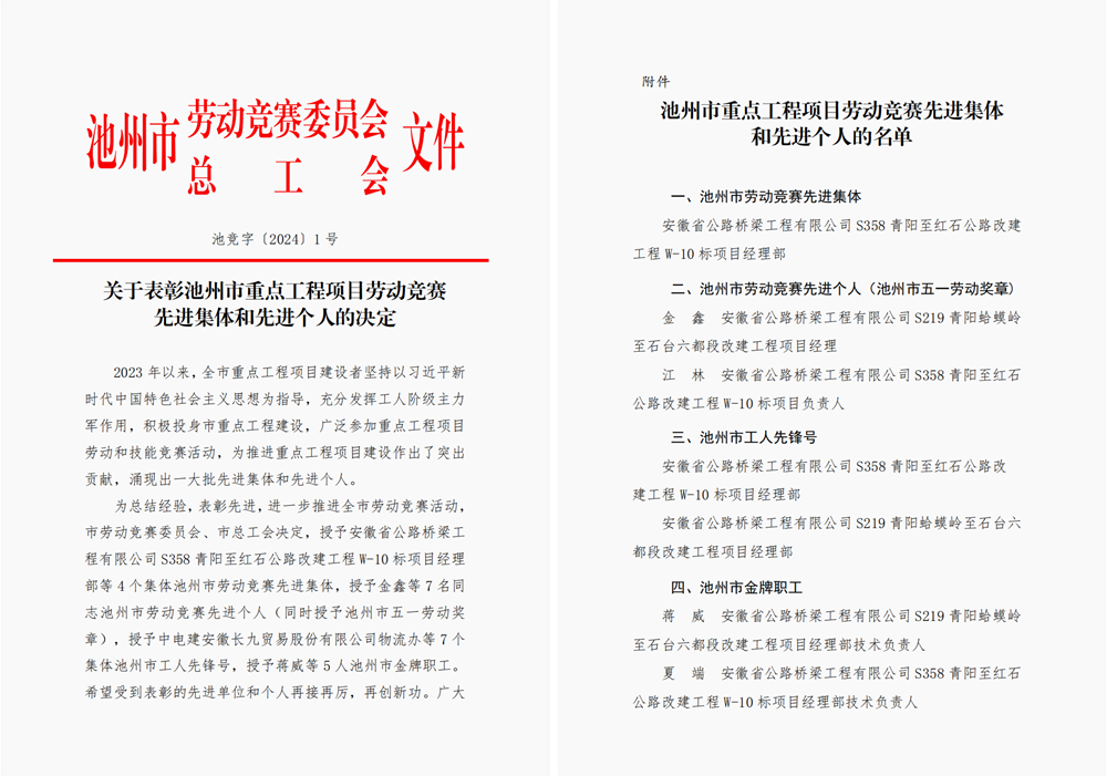 近日,池州市勞動競賽委員會、市總工會印發(fā)《關(guān)于表彰池州市重點工程項目勞動競賽先進集體和先進個人的決定》,公司所屬S358青陽至紅石公路改建工程W10標項目經(jīng)理部獲評“市勞動競賽先進集體”,金鑫、江林兩名同志獲評“市勞動競賽先進個人”,同時授予池州市五一勞動獎?wù)?;S358改建W10標、S219青陽改建兩個項目獲評“市工人先鋒號”,蔣威、夏端兩名同志獲評池州市“金牌職工”。