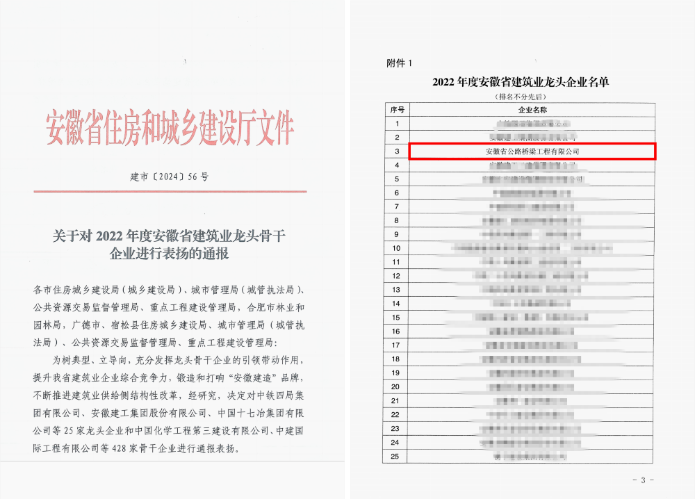 近日,安徽省住房和城鄉(xiāng)建設(shè)廳發(fā)文,對安徽路橋等25家2022年度安徽省建筑業(yè)龍頭企業(yè)和428家骨干企業(yè)進行了通報表揚。