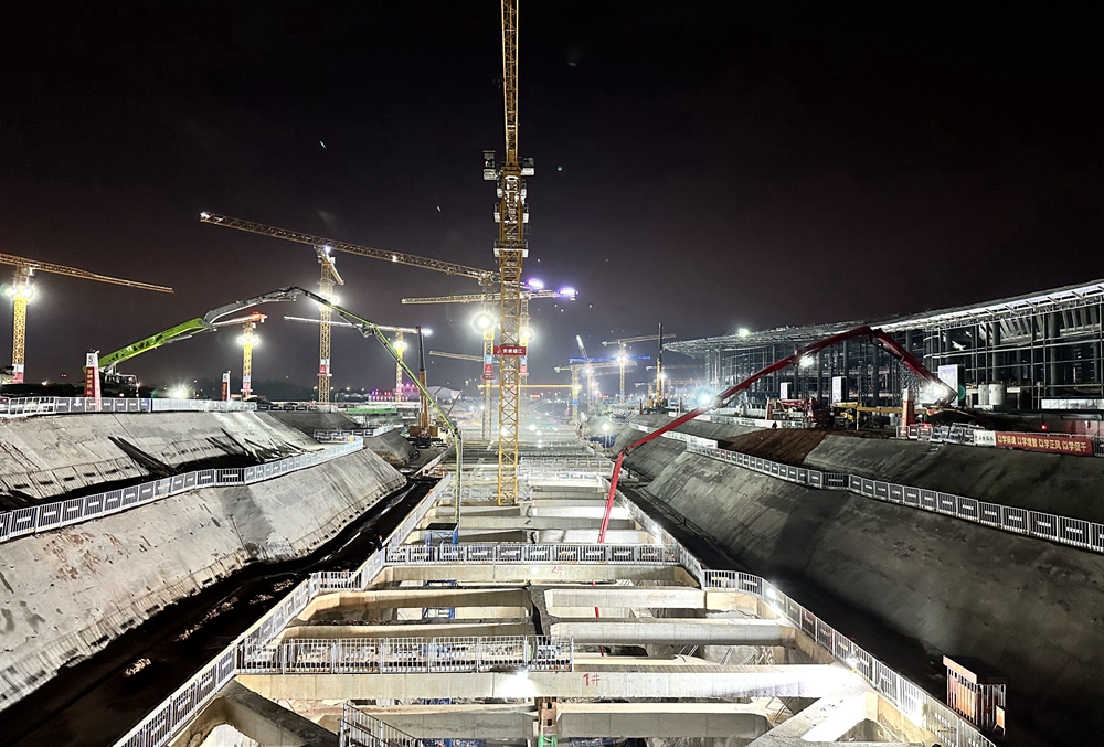 6月18日,合肥新橋國際機場綜合交通中心項目經(jīng)過一晚上的鏖戰(zhàn),成功完成合新六城際鐵路新橋機場站先行工程首塊軌頂風(fēng)道澆筑施工。