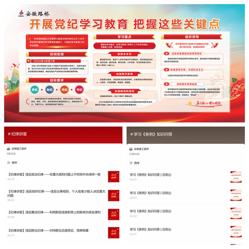 黨紀學習教育開展以來,公司黨委高度重視宣傳引導、氛圍提升。為擴大宣傳引導的接觸面,公司黨委統(tǒng)籌制定發(fā)布了黨紀學習教育展板。同時,立足“清風路橋”建設,加大宣傳力度,綜合運用官網、官微,設立“紀律講堂”“學習《條例》知識問答”等專欄,累計推出黨紀學習教育相關報道和學習材料80余篇次,做到“每日推送”。組織全體黨員職工參加公司內網《條例》線上知識測試,以考助學、以訓促學,鞏固學習成果,檢驗學習成效,在全公司營造學紀、知紀、明紀、守紀的良好氛圍。各級黨組織通過“三會一課”等方式開展專題學習230余次,受教育黨員、職工累計超2500人次。