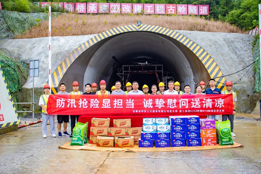 7月14日下午,共青團(tuán)池州市委副書(shū)記、市青聯(lián)主席蔣業(yè)健帶隊(duì)到公司承建的S358改建W10標(biāo)古嶺隧道施工現(xiàn)場(chǎng),開(kāi)展“防汛搶險(xiǎn)顯擔(dān)當(dāng) 誠(chéng)摯慰問(wèn)送清涼”活動(dòng),看望慰問(wèn)奮戰(zhàn)在施工一線的建設(shè)者們,叮囑要科學(xué)安排施工和休息時(shí)間,并送來(lái)防暑降溫物資。