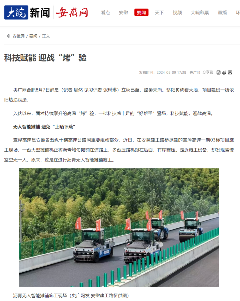 宣涇高速是安徽省五縱十橫高速公路網(wǎng)重要組成部分。近日,在安徽建工路橋承建的宣涇高速一期03標項目施工現(xiàn)場,一臺大型攤鋪機正將瀝青均勻攤鋪在道路上,多臺壓路機跟在后面,有序碾壓。走近施工設備,卻發(fā)現(xiàn)駕駛室空無一人。原來,這是在進行瀝青無人智能攤鋪施工。