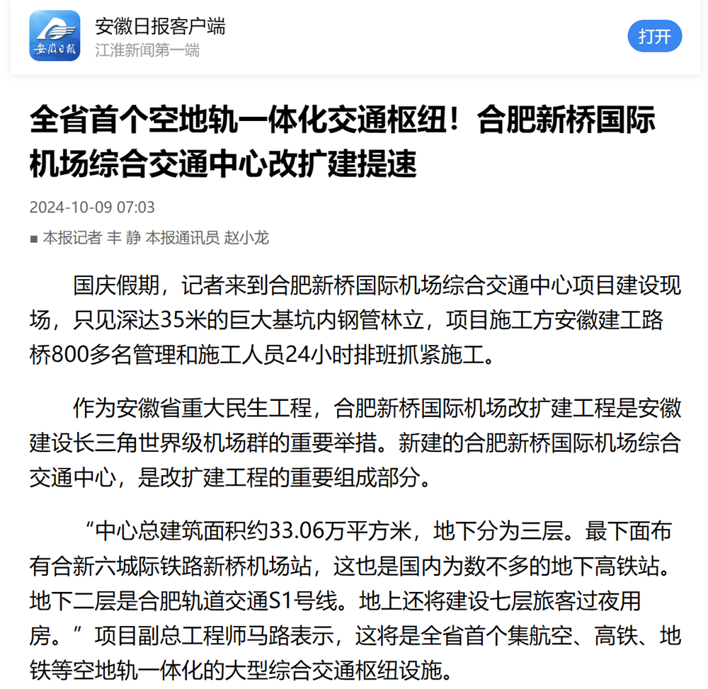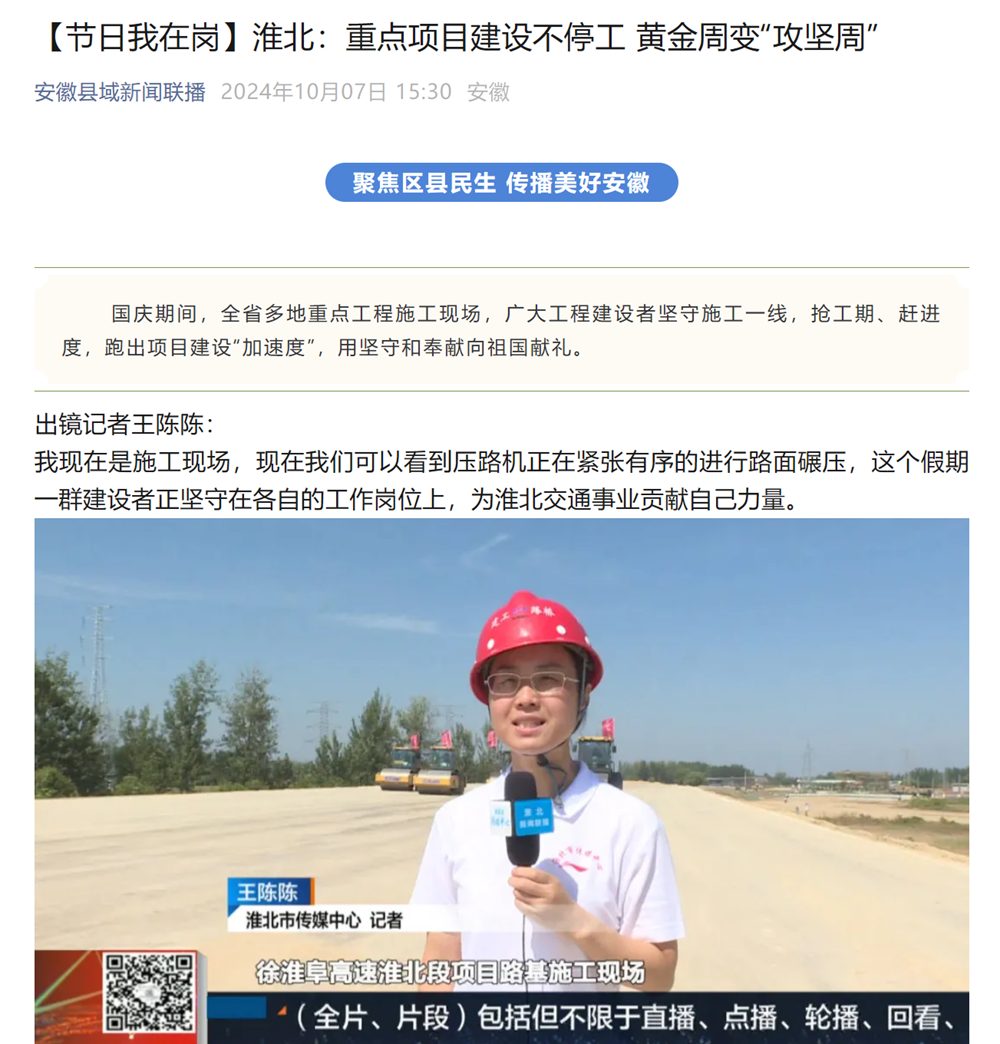 國慶前后,安徽新聞聯(lián)播、安徽日報、江淮晨報等多家省級主流媒體紛紛聚焦公司承建的涇青高速04標(biāo)、徐淮阜高速淮北段、合肥新橋國際機(jī)場綜合交通中心等重點項目建設(shè)情況進(jìn)行報道。
