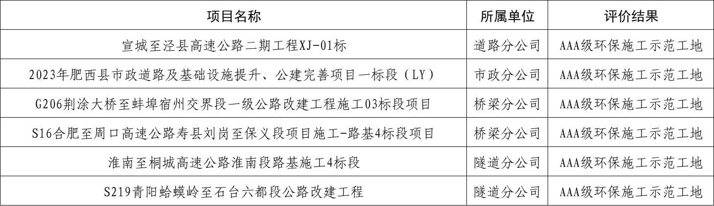 近日,從安徽省環(huán)境保護(hù)產(chǎn)業(yè)協(xié)會(huì)傳來(lái)佳訊,公司承建的G206-03標(biāo)、淮桐高速淮南段路基4標(biāo)、肥西市政項(xiàng)目等6個(gè)項(xiàng)目,獲評(píng)安徽省2024年度“AAA級(jí)環(huán)保施工示范工地”稱號(hào)。