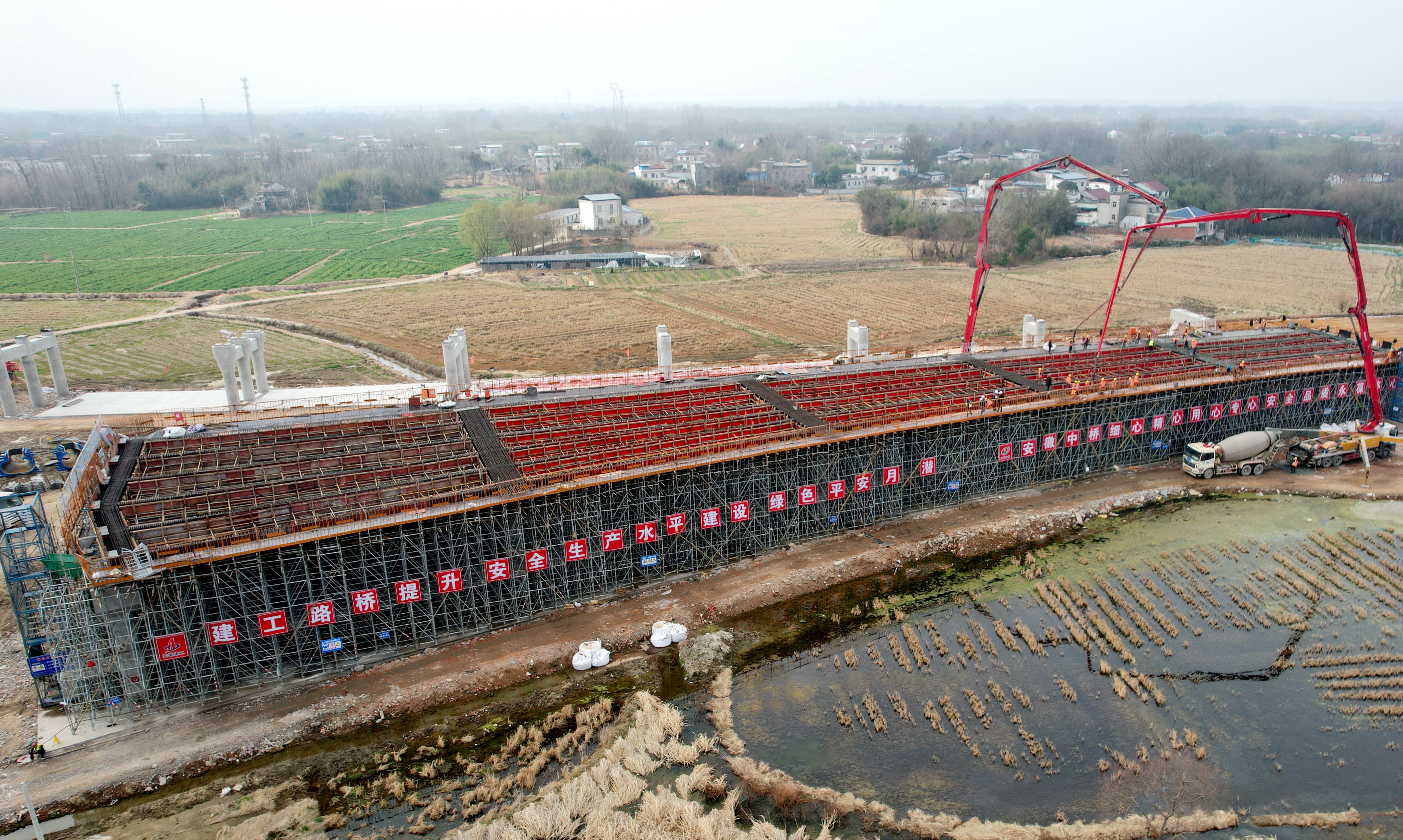 作為項目控制性工程——潛山南樞紐的重要組成部分,本次現澆梁節(jié)段全聯(lián)共計125米,澆筑約1150方。項目部多次召開技術交底會,通盤掌握物料機情況,優(yōu)化施工方案,在澆筑過程中,對地基處理、支架搭設、頂板鋼筋綁扎、頂板砼澆注等工序嚴格把關,確保了現澆梁施工的質量和安全。