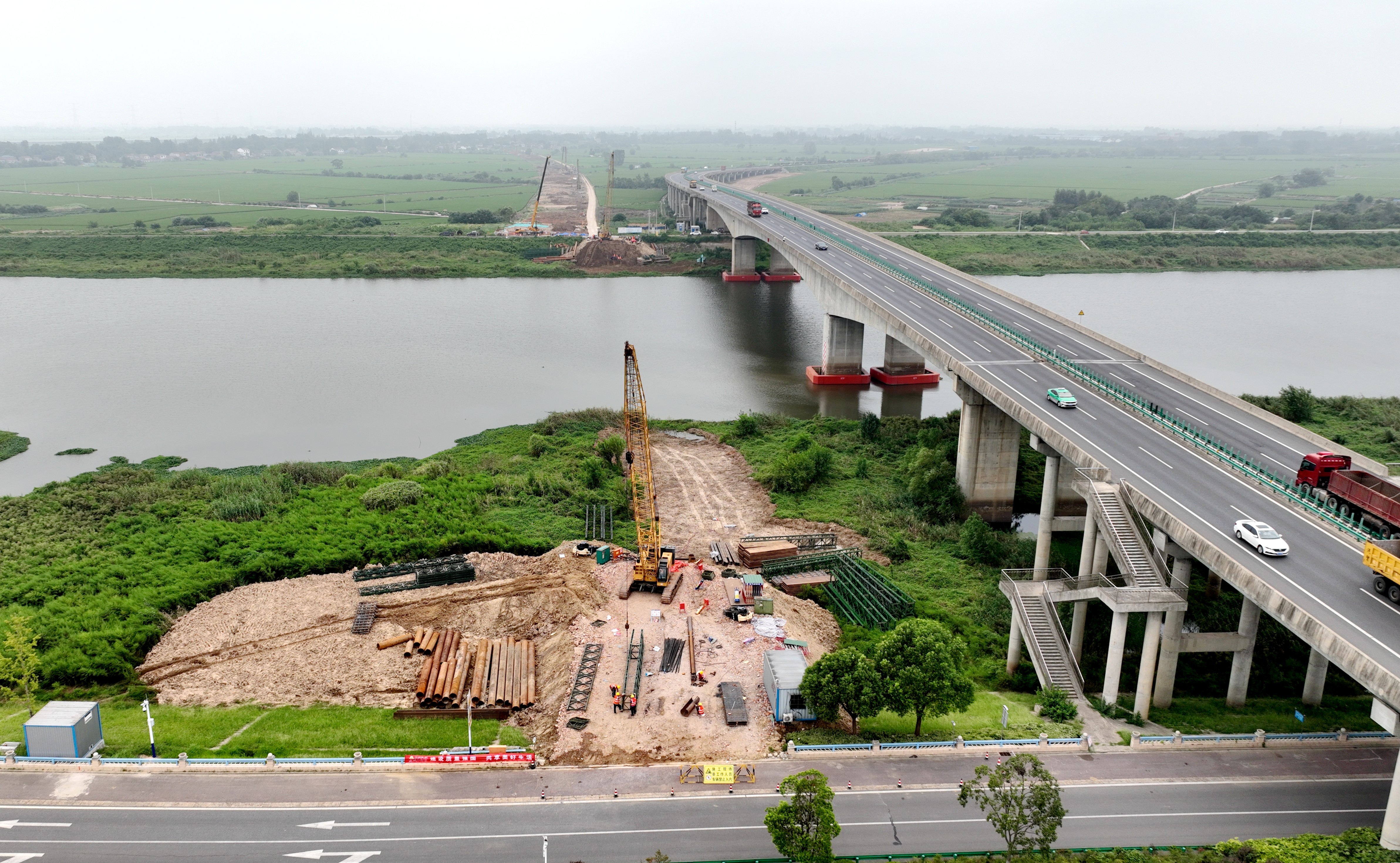 作為全線重難點及控制性工程,杭埠河特大橋全長約5.63公里,主橋采用85+150+85米矮塔斜拉橋結(jié)構(gòu),橫跨杭埠河核心河道,其施工進(jìn)度直接關(guān)系項目整體工期。項目結(jié)合現(xiàn)場地質(zhì)條件與施工環(huán)境,多次組織行業(yè)專家召開技術(shù)研討會,創(chuàng)新采用“南北兩岸同步推進(jìn)、流水作業(yè)銜接”模式提速攻堅,保障主墩、過渡墩施工的順利推進(jìn)。反復(fù)優(yōu)化專項施工方案,全程嚴(yán)格把控工藝標(biāo)準(zhǔn)與安全管控細(xì)節(jié),確保東一支渠大橋首根樁基的順利澆筑。