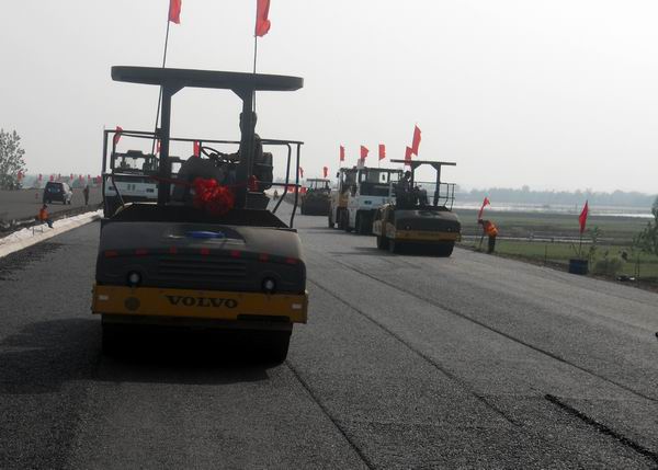 56,自上午10時(shí)開始,歷經(jīng)7個(gè)半小時(shí),蚌淮路面01標(biāo)順利完成AC-25瀝青砼下面層試驗(yàn)段的鋪筑。試驗(yàn)段樁號(hào)為K22+400~K22+800(右幅),結(jié)構(gòu)層厚8cm,施工寬度15m。項(xiàng)目辦副主任許澤寧親自檢查該部試驗(yàn)段的準(zhǔn)備工作情況,并多次給予指導(dǎo)。公司副總經(jīng)理、總工程師彭申凱及路面公司黨支部書記王年保、副總經(jīng)理陳智當(dāng)日也來到該部,指導(dǎo)試驗(yàn)段施工。