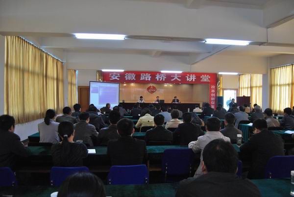 公司領導、項目部及分支機構領導、機關全體員工等一百多人參加了揭牌儀式和講座,揭牌儀式及講座由公司黨委書記陳光磊主持。公司總經(jīng)理汪衛(wèi)東在揭牌儀式上發(fā)表了重要講話。汪總首先對戴總在百忙中抽空為安徽路橋大講堂啟動授課表示衷心的感謝,隨后汪總從實現(xiàn)公司十二五發(fā)展戰(zhàn)略規(guī)劃及加強公司人力資源開發(fā)和培訓工作兩方面闡述了安徽路橋大講堂開辦的重要意義。汪總強調指出通過大講堂這一平臺的建設,將進一步提升公司管理人員的管理能力和技巧,更新管理理念和思路;加強各類專業(yè)技術人員的交流與學習,推廣新技術、新經(jīng)驗;并通過宣貫公司戰(zhàn)略規(guī)劃和企業(yè)文化理念,進一步統(tǒng)一員工的思想,促進共同價值觀的形成。汪總還對安徽路橋大講堂的組織者和所有參與者提出了具體的要求。