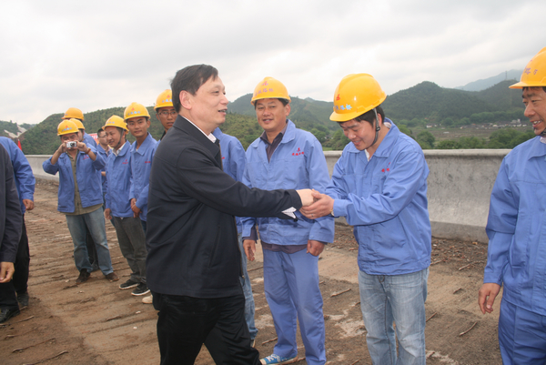 此次視察正值我標(biāo)實(shí)現(xiàn)單幅貫通之際。馬廳長一行經(jīng)全南互通區(qū)、聶徐桃江大橋、1#預(yù)制梁場,抵達(dá)我標(biāo)桃江大橋施工現(xiàn)場。一下車,馬廳長便在我標(biāo)項(xiàng)目經(jīng)理羅權(quán)引領(lǐng)下來到全體在建員工面前,親切地與大家一一握手,并說道:“安徽路橋的同志們辛苦了!”隨后,在聽取了羅權(quán)的簡短匯報(bào)后,馬廳長一行對目前我標(biāo)項(xiàng)目建設(shè)情況有了進(jìn)一步的了解。針對年底建成通車的總體建設(shè)目標(biāo),馬廳長詳細(xì)詢問了后續(xù)的施工計(jì)劃,羅權(quán)表示,在各級(jí)領(lǐng)導(dǎo)的關(guān)心幫助下,安徽路橋有信心也有決心按期完成建設(shè)任務(wù)。