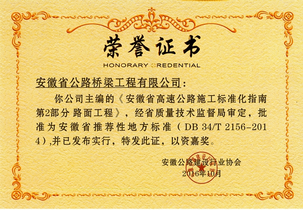 會(huì)上,省交通廳對在系列指南編寫工作中作出貢獻(xiàn)的單位和個(gè)人給予了表彰并頒發(fā)榮譽(yù)證書。公司主編的 《安徽省高速公路施工標(biāo)準(zhǔn)化指南 第2部分路面工程》(DB 34/T 2156-2014)獲得表彰,并經(jīng)省質(zhì)量技術(shù)監(jiān)督局審定批準(zhǔn)為安徽省推薦性地方標(biāo)準(zhǔn),發(fā)布實(shí)行。
