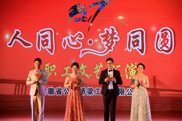 演出現(xiàn)場(chǎng)二樓眺臺(tái)正上方懸掛著醒目的橫幅:“堅(jiān)持創(chuàng)新引領(lǐng) 搶抓發(fā)展機(jī)遇 為早日實(shí)現(xiàn)‘兩個(gè)超百億’目標(biāo)而努力奮斗”,舞臺(tái)正中,“人同心 夢(mèng)同圓”的晚會(huì)主題熠熠生輝。公司黨委書記、董事長(zhǎng)、總經(jīng)理孫學(xué)軍在致辭中指出,2016年,在建工集團(tuán)黨委的正確領(lǐng)導(dǎo)下,公司迎來了發(fā)展史上具有里程碑意義的一年,公路工程施工總承包特級(jí)資質(zhì)和行業(yè)工程設(shè)計(jì)甲級(jí)資質(zhì)順利獲批,發(fā)展質(zhì)量大幅提升,競(jìng)爭(zhēng)力、影響力不斷增強(qiáng),職工文化生活豐富多彩,企業(yè)活力、凝聚力進(jìn)一步增強(qiáng),這是廣大職工共同奮斗的結(jié)果,他代表公司黨委和領(lǐng)導(dǎo)班子向全體職工及家屬表示衷心的感謝和崇高的敬意。對(duì)下一步工作,孫學(xué)軍強(qiáng)調(diào),2017年,要充分發(fā)揮特級(jí)資質(zhì)優(yōu)勢(shì),總結(jié)提升信息化建設(shè),繼續(xù)完善各項(xiàng)基礎(chǔ)管理,進(jìn)一步加強(qiáng)企業(yè)凝聚力,繼續(xù)推進(jìn)公司改革發(fā)展事業(yè)向前發(fā)展。