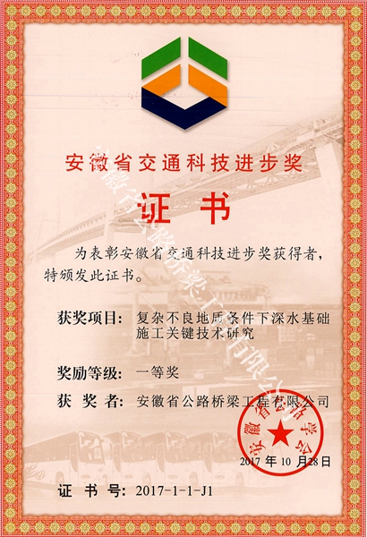 《復(fù)雜不良地質(zhì)條件下深水基礎(chǔ)施工關(guān)鍵技術(shù)研究》是以濟(jì)祁淮河特大橋基礎(chǔ)施工為背景,深入研究了樁基施工到圍堰施工一體系成套基礎(chǔ)施工關(guān)鍵技術(shù),創(chuàng)新式的改進(jìn)結(jié)構(gòu)及施工工藝使得體系結(jié)構(gòu)受力合理。該施工技術(shù)及理論從實(shí)踐中總結(jié)得出,并在項(xiàng)目施工中成功驗(yàn)證。2017年7月,經(jīng)中國公路建設(shè)行業(yè)協(xié)會(huì)組織的專家鑒定,該技術(shù)成果達(dá)到國際先進(jìn)水平?!洞笄输摌蛎驿佈b雙層高粘SMA瀝青瑪蹄脂碎石施工技術(shù)》重點(diǎn)對大曲率鋼橋的安裝施工方法進(jìn)行了描述,同時(shí)橋面鋪裝施工首次采用基質(zhì)瀝青添加直投式RST高粘瀝青改性劑,采用特殊的礦料級(jí)配,結(jié)合靜態(tài)碾壓工藝,成功解決了鋼橋面變形性能導(dǎo)致的壓實(shí)度不易控制的難題,有效提高了施工質(zhì)量。2017年7月,經(jīng)專家鑒定,該技術(shù)成果達(dá)到國內(nèi)先進(jìn)水平。