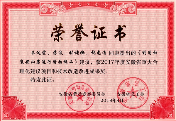 公司14項合理化建議榮獲“安徽省重大合理化建議項目和技術改造改進成果獎”