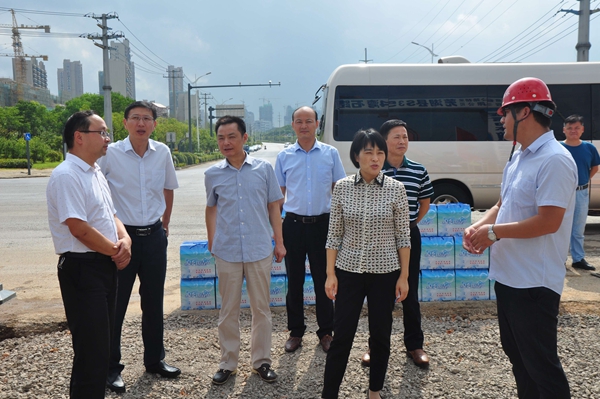 蕪湖縣長韋秀芳一行到S354項目開展“送清涼”慰問 發(fā)布時間:2019年08月12日 來源:市政分公司 發(fā)布人: 作者:文/孫亞南 圖/杜浩偉 瀏覽:3482次 8月9日上午,蕪湖縣委副書記、縣長韋秀芳一行到S354青弋江橋項目開展“送清涼”慰問活動,縣交通運輸局局長許小兵等陪同。 在施工現(xiàn)場,韋秀芳聽取了項目負責人關(guān)于施工進展和防暑降溫措施落實等方面工作匯報,對高溫天氣下堅守崗位的一線建設(shè)者表示感謝。韋秀芳一行送來了礦泉水等防暑降溫用品,叮囑大家要勞逸結(jié)合,時刻注意身體健康,項目要科學(xué)合理安排施工,確保工作人員在炎熱夏季作業(yè)安全。
