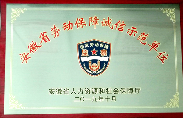 11月6日,安徽省人力資源和社會保障廳舉行2019年安徽省勞動保障誠信示范單位授牌儀式,經過綜合評審和社會公示等選拔程序,公司榮獲“2019年安徽省勞動保障誠信示范單位”稱號。