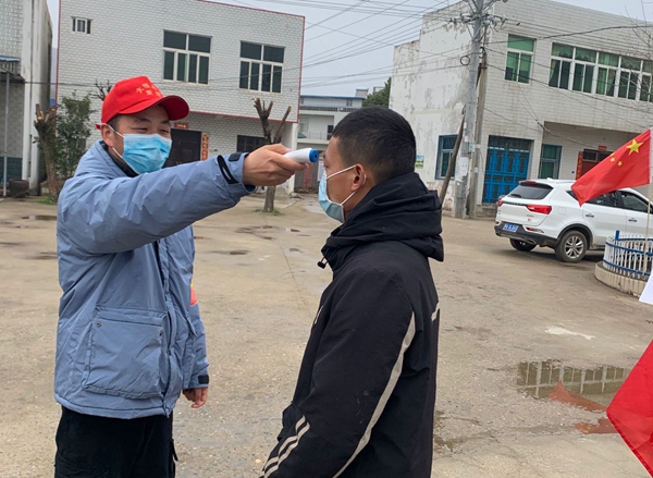 中共黨員董峰在為村民測量體溫