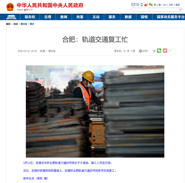 近日,中華人民共和國(guó)中央人民政府官方網(wǎng)站、新華社同時(shí)以《合肥軌道交通復(fù)工忙》為題,報(bào)道了公司承建的合肥軌道交通4號(hào)線(xiàn)長(zhǎng)寧大道站復(fù)工復(fù)產(chǎn)情況,用8張圖片展現(xiàn)了現(xiàn)場(chǎng)全面復(fù)工復(fù)產(chǎn)后的施工場(chǎng)景。