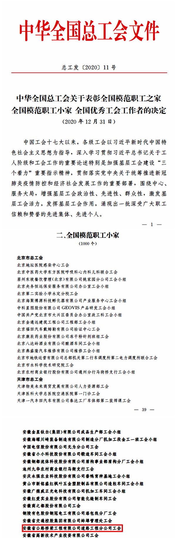 近日,中華全國總工會印發(fā)《中華全國總工會關于表彰全國模范職工之家全國模范職工小家全國優(yōu)秀工會工作者的決定》,道路分公司入選“全國模范職工小家”榮譽稱號,為公司工會工作注入新的成色。